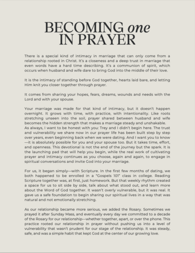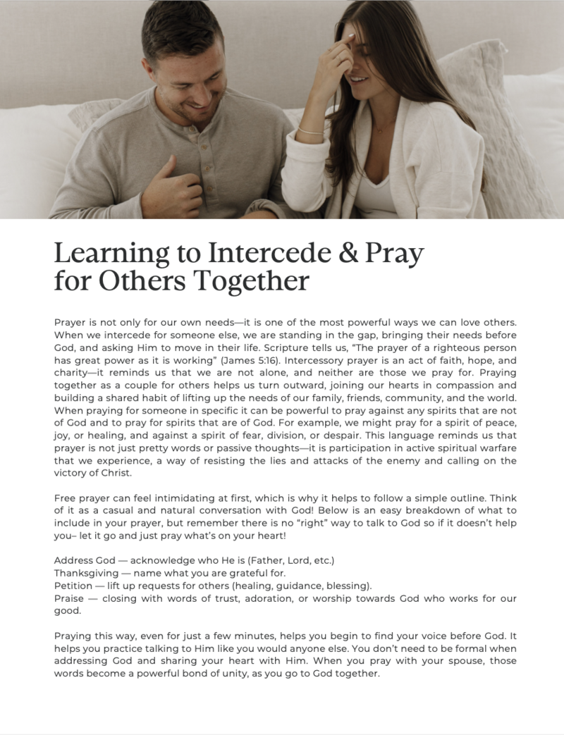 A 50+ page step-by-step digital devotional designed to help you and your spouse build the habit of praying together, deepen your intimacy with God, and root your marriage firmly in Christ.